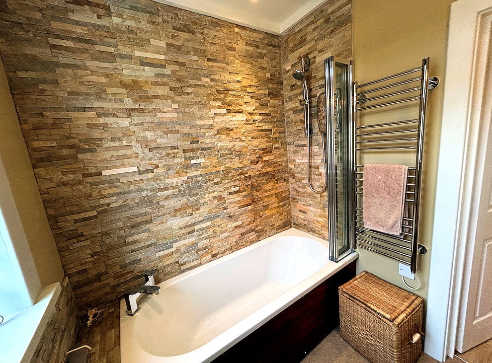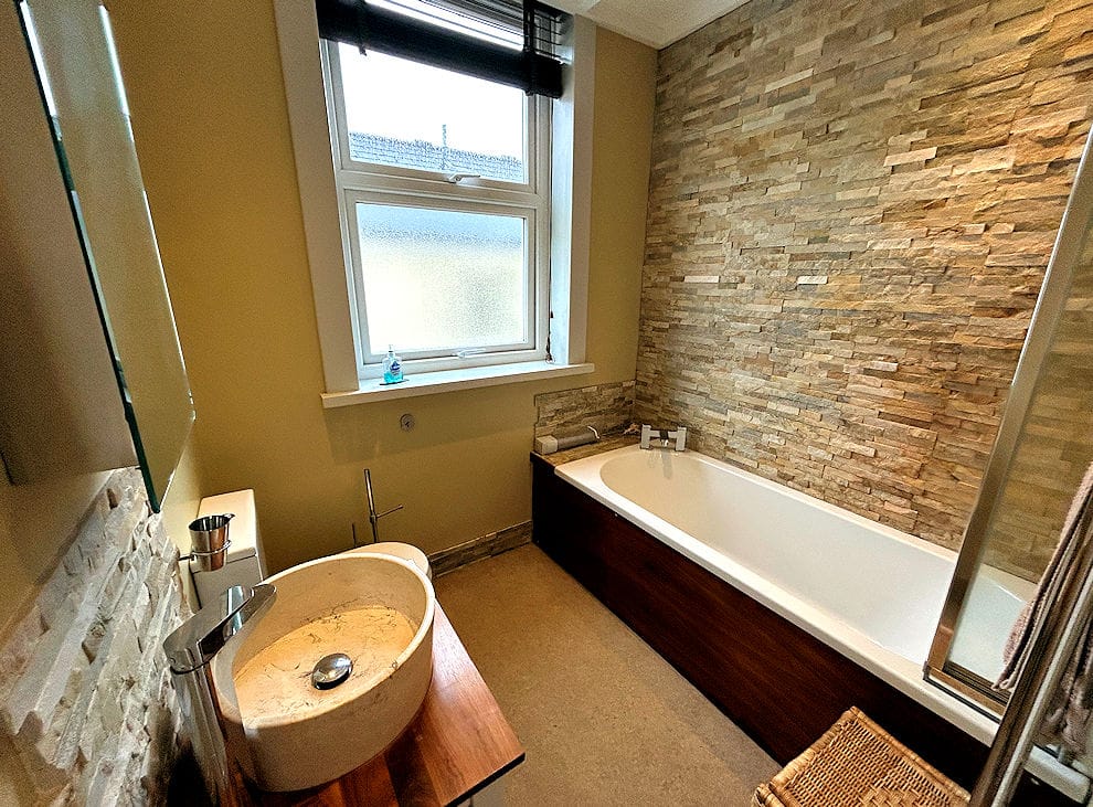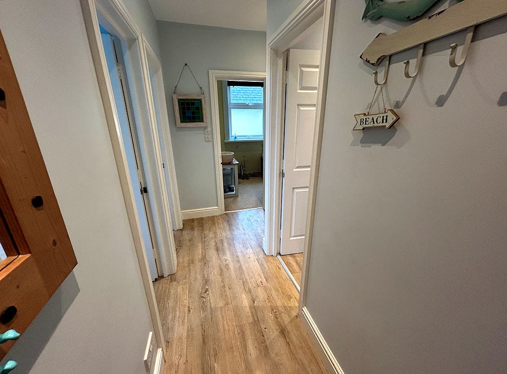 Entrance hallway with double bedroom and 5ft King Size bed, Sitting/dining room with comfortable furniture and flat screen TV, Kitchen with fridge with small freezer compartment, electric cooker with ceramic hob, microwave oven, Nespresso machine and toaster, Bathroom with bath and shower over, hand basin and WC. Airing cupboard. There is a Utility area with access to a washing machine and tumble dryer on the ground floor.